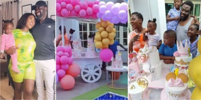 She shared a video of herself with her husband and their children setting up decorations in an outdoor area of their home in preparation for Divine’s first birthday bash.