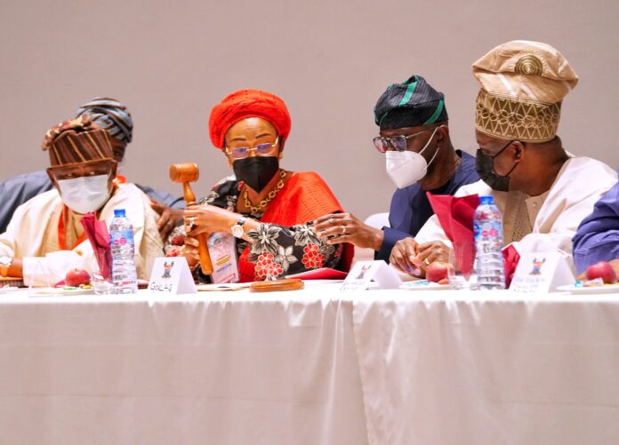 L-R: Senator Olamilekan Solomon; Senator Oluremi Tinubu; Lagos State Governor, Mr. Babajide Sanwo-Olu and Senator Ibikunle Amosun during the opening of the senate committee zonal public hearing on the review of the 1999 constitution at the Lagos Marriott Hotel, Ikeja, on Wednesday, May 26, 2021.