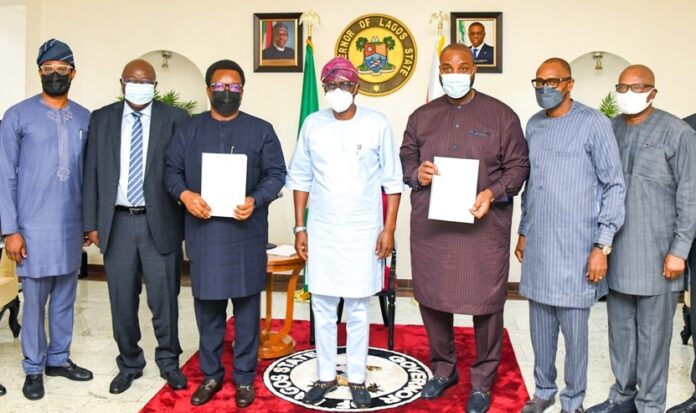 L-R: Lagos State Governor, Mr. Babajide Sanwo-Olu, flanked by the Managing Director/C.E.O, Niger Delta Power Holding Company (NDPHC), Mr. Chiedu Ugbo and Managing Director/C.E.O of Eko Electricity Distribution Company (EKEDC), Mr. Adeoye Fadeyibi, during a signing of Memorandum of Understanding for provision of reliable electric power supply in Ibeju Lekki and other parts of EKEDC distribution franchise, held at Lagos House, Marina, on Tuesday, May 25, 2021.